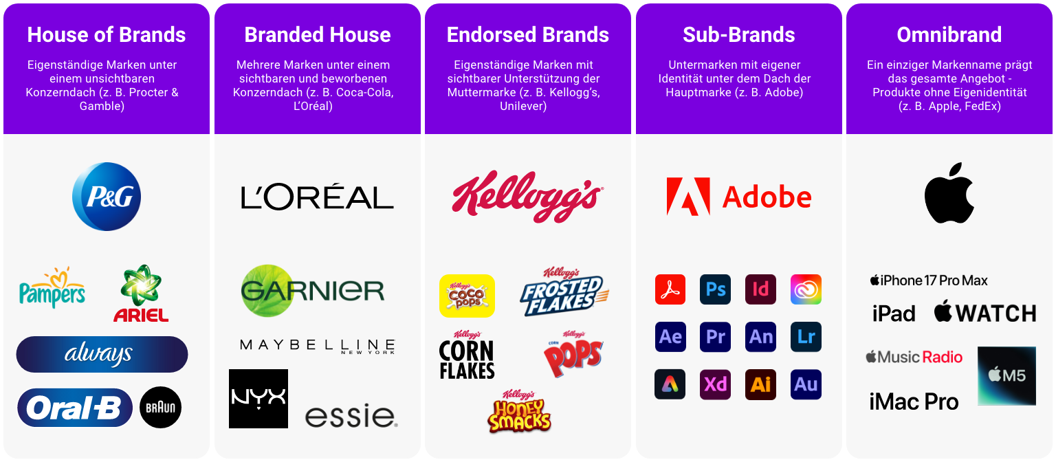 House of Brands (Markenhaus): Das Unternehmen betreibt mehrere eigenständige Marken, die jeweils ihre eigene Identität haben. Die Konzernmarke tritt gegenüber dem Endkunden kaum in Erscheinung. Procter & Gamble wird häufig als Beispiel genannt: Die meisten Verbraucher kennen Ariel, Pampers oder Gillette, sind sich aber nicht unbedingt bewusst, dass diese zu P&G gehören.